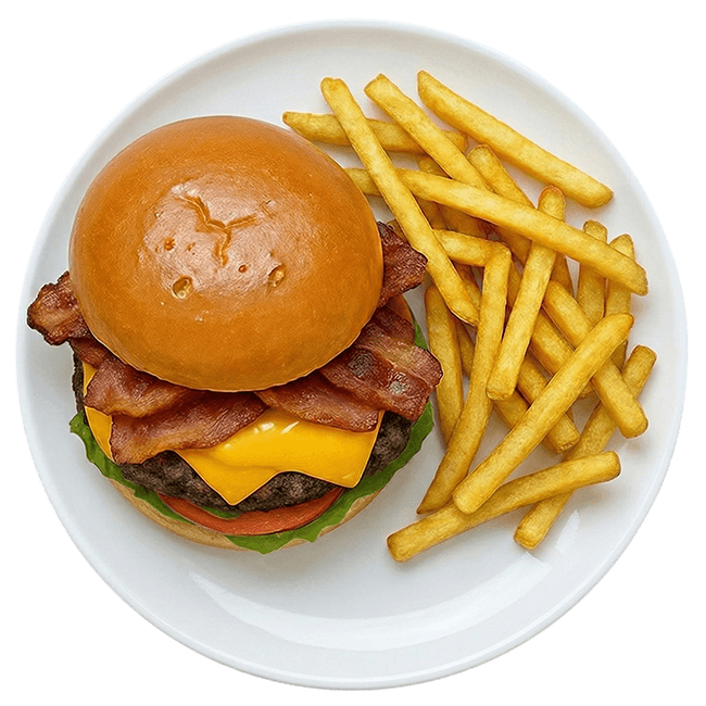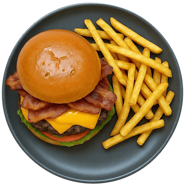 A fully loaded Angus burger with cheese, ham, bacon, lettuce, and tomato — a signature comfort classic.