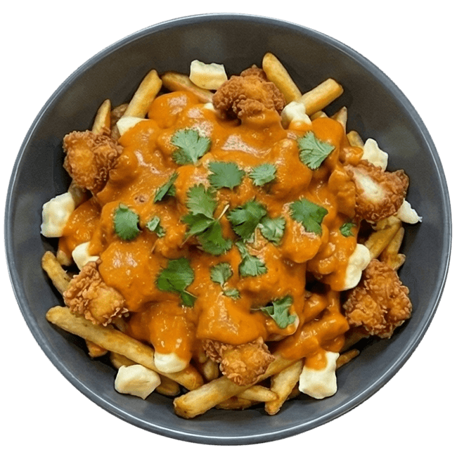 A unique fusion dish with crispy chicken, cheese curds, and velvety butter chicken sauce.