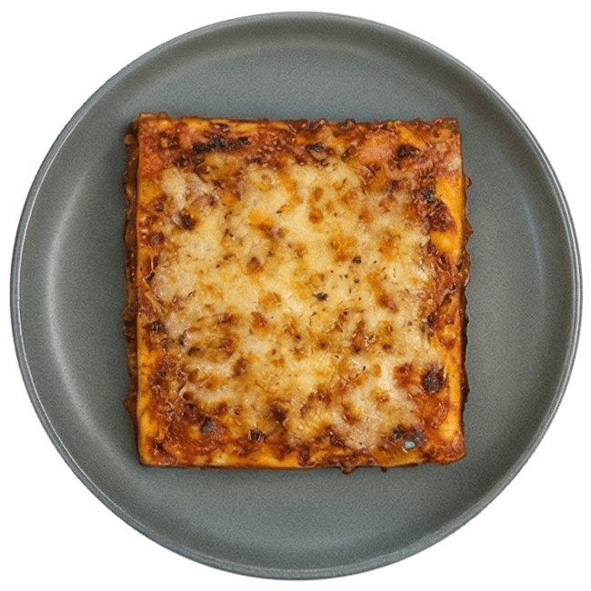 House-style baked lasagna layered with mozzarella, meat sauce, olives, feta, and Mediterranean spices.